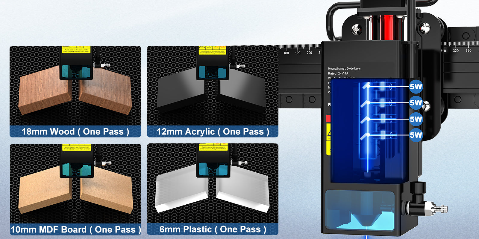 The expansion kit can extend the Y axis, making it themost cost-effective large-area laser engraving machine with a maximum expansion area of 410X900mm.